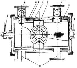 1.操作手柄2.進(jìn)水管3.收球網(wǎng)4.清洗器外殼5.分水器6.總進(jìn)水管7.膠球投放口8.換向閥9.銅軸承10.排水管