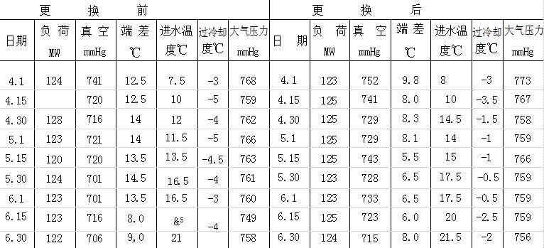 2、每臺機每兩天進行一次膠球清洗,每次投入300個膠球,清洗1小時,收球半小時。經(jīng)過兩年的實踐,證明14FH-5-0凈水器和S-14-0收球網(wǎng)操作方便、除污性強、耐海水腐蝕、收球率在95%以上、對凝汽器冷卻管保護膜沒有損壞、減輕了檢修人員的勞動。凝汽器各項經(jīng)濟指標大有好轉,經(jīng)濟效益顯著提高。以1號機為例,更換前、后每月抽出三天,以每天上午9點鐘的運行參數(shù)進行同期比較,見附表.