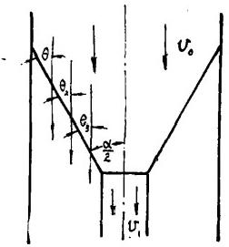 (1)進(jìn)入下方箱的中心部分流體(以下簡稱中心部分流體)既不加速也不減速,其余部分流體亦不發(fā)生變化。對于無粘性流體,此時V?=V。。在這種情況下流線不發(fā)生任何變化:仍為平行直流線。各處流線與收球網(wǎng)板的夾角均相等,等于網(wǎng)板與中心線的夾角(圖2),即式中α為收球網(wǎng)板的設(shè)計夾角。