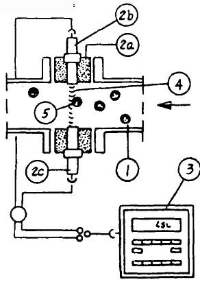 1—膠球再循環(huán)管;2—光屏;2a—連接件;2b—發(fā)射器;2c-接受器;3—微處理器(BRM-1P);4—紅外線光束;5—軟膠球