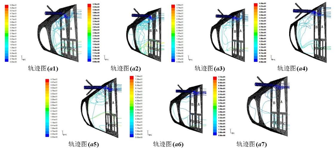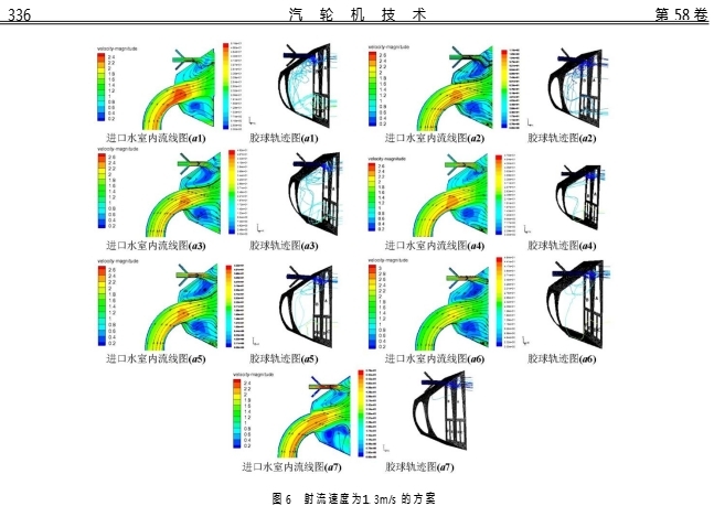 1m/s,a1表示射流速度U=1.3m/s、膠球速度V=1m/s。射流速度為1.3m/s時結(jié)果分析圖6表示對A區(qū)域上部分冷卻管束進(jìn)行清洗,射流速度為1.3m/s時,送球速度分別為1.0m/s、1.2m/s、1.4m/s、1.6m/s、1.8m/s、2.0m/s、2.2m/s,進(jìn)口水室內(nèi)的流線圖和膠球軌跡圖。對膠球通過A、B、C、D、E、F6個區(qū)域的情況進(jìn)行統(tǒng)計(jì),結(jié)果見表1。