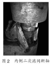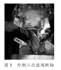 (1)膠球清洗二次濾網(wǎng)動力軸和排污斗短軸直徑90mm,軸頸過小,在連續(xù)旋轉(zhuǎn)過程中膠球清洗二次濾網(wǎng)受水流沖擊較大,在運行過程中共出現(xiàn)6次動力軸和短軸斷裂事故,如圖1和圖2所示。