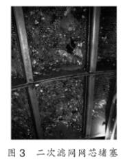 (3)膠球清洗二次濾網(wǎng)網(wǎng)芯孔徑過小,僅為中8mm,運行過程中垃圾極易造成網(wǎng)芯的堵塞(圖3)。在夏季垃圾.較多時期,每臺膠球清洗二次濾網(wǎng)平均每兩.周需要清理一次。當膠球清洗二次濾網(wǎng)隔離人工清理時,凝汽器鈦管水側(cè)出現(xiàn)斷水,在凝汽器汽側(cè)汽流沖擊下?lián)Q熱管束的振動增大,造成管束和管板間磨損。另外,隔離時鈦管會出現(xiàn)溫度升高現(xiàn)象,致使鈦管膨脹加長。由于兩側(cè)管板間距變化較小,鈦管膨脹加長后會產(chǎn)生拱起彎曲,與管隔板間的磨損加劇。上述因素極易造成鈦管的磨損穿孔,致使凝汽器出現(xiàn)泄漏,影響機組整個汽水系統(tǒng)的安全。