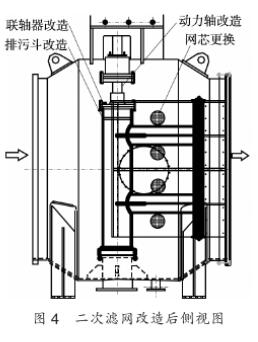 (②動力軸改造。將原來的膠球清洗二次濾網(wǎng)動力軸(上軸)更改為雙相不銹鋼材質(zhì)的軸,軸徑由目前的90mm改造為120mm,軸受剪切力F=3.14rσ,其中,σ為屈服強度,r=中/2。經(jīng)過計算,新軸剪切力.約為原軸的1.8倍。軸與減速箱連接尺寸不變。