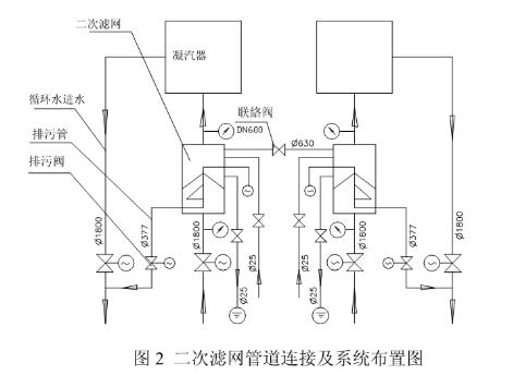 3.1根據(jù)調(diào)研的狀況,在循環(huán)水旋轉(zhuǎn)濾網(wǎng)后增長(zhǎng)二次循環(huán)水濾網(wǎng)可以有效的解決旋轉(zhuǎn)濾網(wǎng)后雜物多的問(wèn)題。二次濾網(wǎng)除污工作原理:當(dāng)循環(huán)水通過(guò)二次濾網(wǎng)