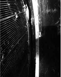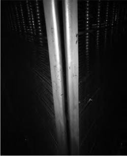 在機組C修中,通過液壓千斤頂對收球網(wǎng)網(wǎng)板進行初步固定,同時利用乙炔焰配合大錘敲擊進行網(wǎng)板形狀矯正,通過火烤、捶打和液壓裝置固定等矯正手段,使得修后收球網(wǎng)網(wǎng)板的中間間隙均小于2mm,如圖5所示,保證了運行期間膠球不會通過間隙漏至長江。